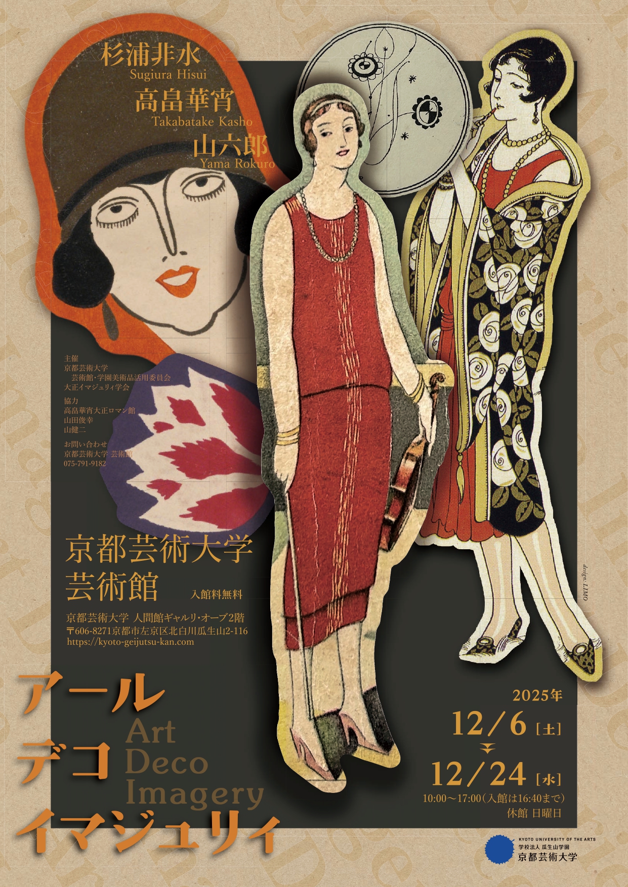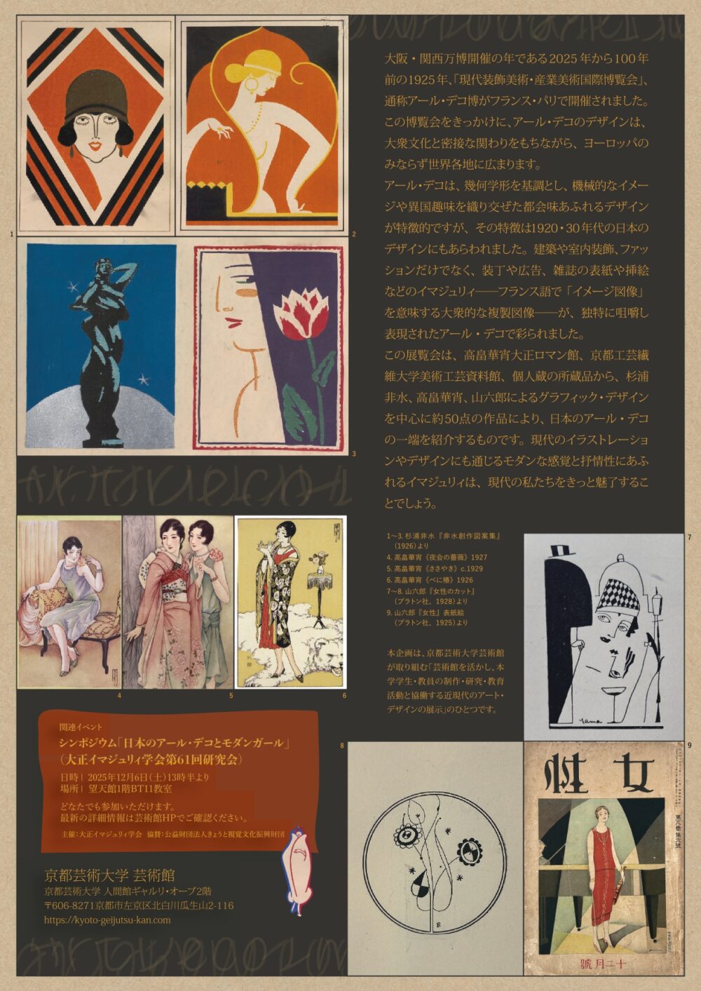 この展覧会は、高畠華宵大正ロマン館、京都工芸繊維大学美術工芸資料館、個人蔵の所蔵品から、杉浦非水、高畠華宵、山六郎によるグラフィック・デザインを中心に約50点の作品により、日本のアール・デコの一端を紹介するものです。
